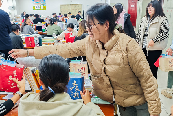 活动当天,活动现场气氛温馨。冷凌走进学生中间,与学生们亲切交流,围绕高效刷题、错题整理、考前心态调整等备考核心问题,结合学科案例进行细致讲解,语言严谨、方法实用,为同学们提供了具有针对性的复习指导;陈熙亲切询问学生们的复习进展与身心状态,及备考中遇到的实际困难,耐心倾听学生们在知识点梳理、时间规划、心理调节等方面的困惑与诉求,全程专注倾听并给予鼓励与慰藉;杨倩则聚焦考研冲刺阶段的关键节点,向学子们明确强调作息规律、饮食健康对备考效率的重要性,劝勉学生们在高强度复习中坚守身体底线,杜绝熬夜透支、饮食不规律等情况。随后,学院师生志愿者一同将暖心礼包送到学生手中,现场暖意融融。一份份礼物,既包含定制文具、透明收纳袋、暖贴等实用物品,也有补充能量的零食。此外,每一份礼包中都包含了一张由教师亲笔写下的祝福卡片。这些礼物承载的不仅是实用的物资,更是全院师生对考研学子的深切关怀与信任。收到礼包的学生们纷纷表示,这份突如其来的温暖缓解了备考压力,让他们感受到自己并非孤军奋战。
