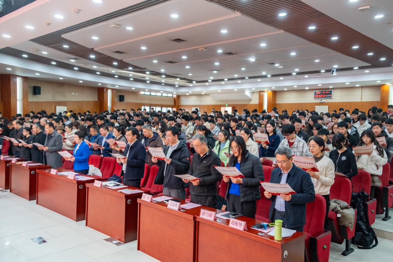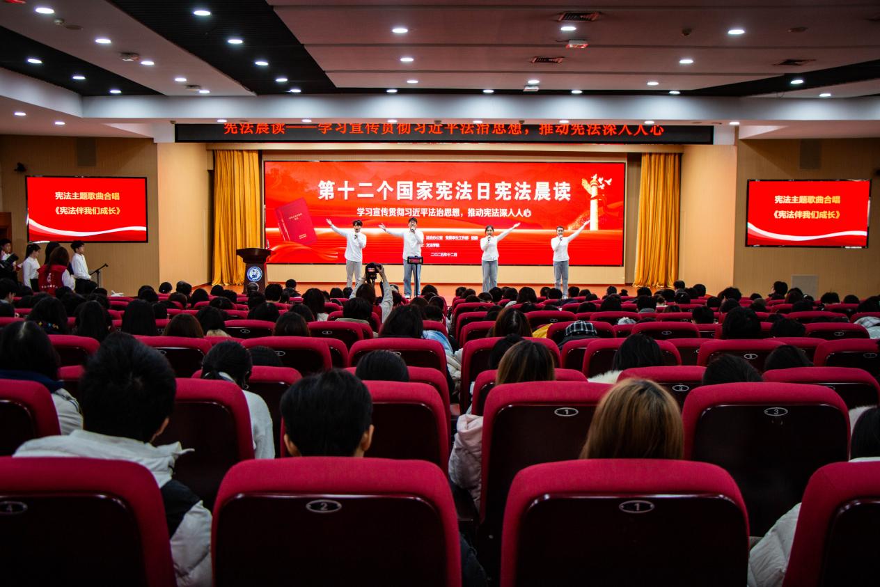 学校总法律顾问、太阳成集团tyc122ccvip院长王学栋教授领读宪法条款,全场师生齐声跟读,声声入耳,句句入心,铿锵有力的诵读声传递着在场师生对宪法的尊崇与信仰。活动现场还为第十届“学宪法讲宪法”比赛获奖学生颁奖。颁奖后,学生代表分别带来宪法主题歌曲《宪法伴我们成长》的演唱与《青春与宪法同行》的朗诵,奏响法治强音。法学专业2023级本科生鲁力萌作为学生代表发言,结合自身普法实践呼吁青年学子做宪法的忠实崇尚者、自觉遵守者和坚定捍卫者。张玲玲在讲话中回顾我国宪法发展历程,阐释宪法根本法地位,并寄语师生:“建设更高水平的法治中国,需要一代又一代青年的接续奋斗。希望你们明法于心,守法于行,将个人理想融入国家法治进步的浪潮。”