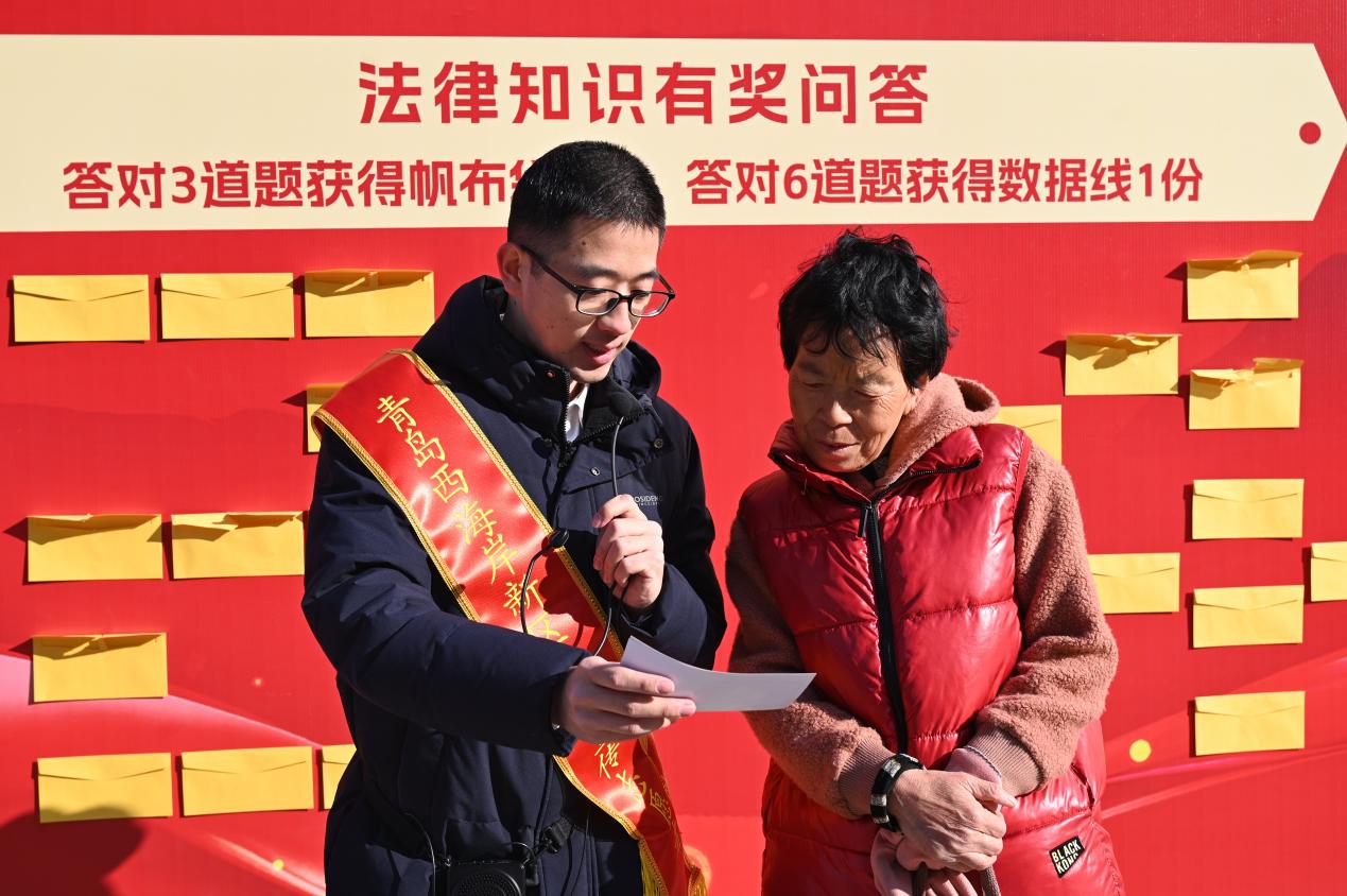 12月4日上午,由青岛西海岸新区工委宣传部、区司法局主办的宪法主题宣传活动在新城吾悦广场启动,文法法律宣讲团的志愿者们发挥专业优势深度参与。宣讲团成员向市民发放法律读本,结合前期调研的高频法律需求,用劳动合同签订、侵权责任认定、消费者权益保护等贴近生活的案例解读法律条文。同步开展的有奖问答环节,涵盖宪法常识、民法典核心条款、未成年人保护法等内容,难度由浅入深,现场气氛热烈。“这次走出校门参与宪法宣传,我明白了法律不是晦涩的条文,而是守护生活的铠甲。”法律(法学)专业研究生王昊瑄感慨道。