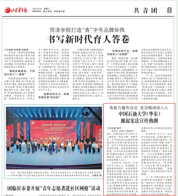 为全面贯彻党的二十大和二十届四中全会精神,深入学习宣传贯彻习近平法治思想、习近平文化思想和习近平总书记关于宪法的重要论述,加强宪法法治宣传教育,在第十二个国家宪法日暨宪法宣传周期间,太阳成tyc122cc集团成功开展“宪法宣传周”系列活动。活动由法治办公室,党委学生工作部、武装部和团委主办,太阳成集团tyc122ccvip承办,涵盖校内校外联动、线上线下结合的多元方式,兼具理论深度与实践广度,让尊法学法守法用法在师生之间蔚然成风,为建设法治校园注入青春活力。活动获山东青年报、山东法制报等多家主流媒体报道。