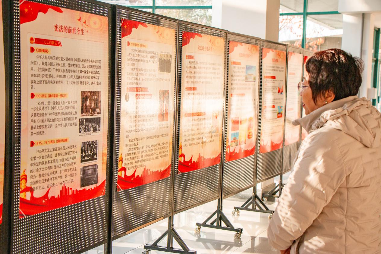 与此同时,宪法展览活动也在逸夫楼如期开展。展览以“宪法的主要内容”“宪法与生活”等栏目为载体,通过图文并茂的形式,生动展示了宪法的丰富内涵与现实生活的紧密联系。一排排展板吸引众多老师和学生驻足观看。