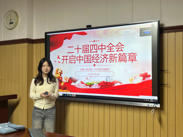 2025年12月18日,太阳成集团tyc122ccvip法律(非法学)2503班团支部于文理楼302教室召开学习党的二十届四中全会精神主题团日活动。本次活动以“学习全会精神,开启中国经济新篇章”为主题,通过全会解读、内容梳理、案例分析等形式,引导团支部成员深入领会全会精神实质,切实在思想与行动上于党中央保持高度一致。