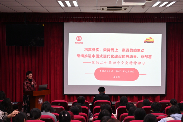 原丽红从党的战略规划、全会的背景与历史地位、核心战略部署及其要求与保障等方面进行系统阐述,详细解读党的二十届四中全会精神。她表示中国共产党是善于做战略规划的党,带领中国人民一步步地共同绘制着民族复兴的壮阔蓝图。她详细对比了“十四五”和“十五五”规划的背景,指出两个五年规划侧重点的不同之处,并强调“十五五”时期是基本实现社会主义现代化的关键时期,在基本实现社会主义现代化进程中具有承前启后的重要地位。她以“十五五”时期的重要地位、宏观要求等多个方面解读《中国共产党第二十届中央委员会第四次全体会议公报》。