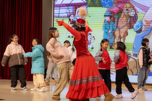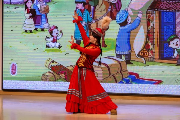 表演结束后,玛依拉热情邀请同学们上台体验舞蹈。她与巴合兰从简单舞步教起,让孩子们熟悉节奏,后引导孩子们两两一组,学习需要协作配合的舞蹈动作。随着音乐再次响起,玛依拉带领所有上台的同学手拉手,围成一个充满欢声笑语的圆圈,共同完成了整段舞蹈。这一刻,课堂变成了传递快乐与文化的舞台,在牵手与跳跃中,哈萨克族的民族文化深入孩子们心中。