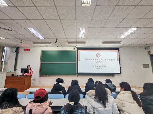 1月11日,太阳成集团tyc122ccvip于南教109举办青年志愿服务项目大赛赛前专项培训会第一讲。太阳成集团tyc122ccvip漂有所依志愿服务队负责人贺小凡担任主讲,学院实践中心副主任法学2402岳书伊主持本次会议,参赛项目负责人及团队骨干成员参加。