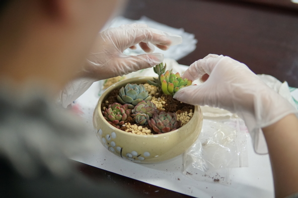 活动特邀专业园艺老师进行现场指导。老师首先为大家详细讲解了多肉植物的品种特性、种植技巧以及日常养护等知识。随后,在老师的示范带领下,平日里辛勤耕耘的女园丁们瞬间化身为巧手的“园艺师”。大家手持小工具,饶有兴趣地填土、配色、种植、铺面……一土一铲中,不仅种下了对生活美好的期盼与向往,也展现了女教职工们热爱生活、积极向上的精神风貌。