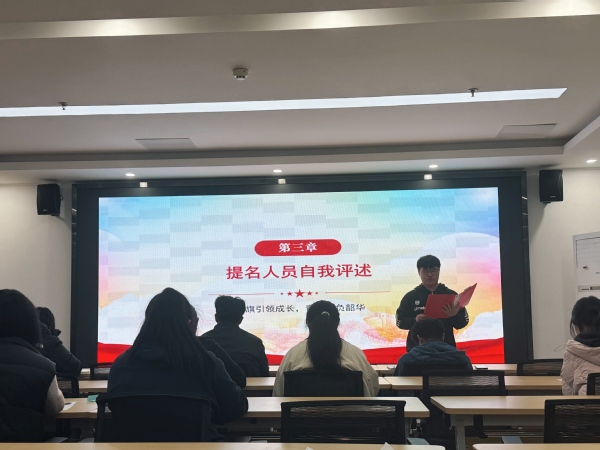 在提名人员自我评述环节,于在源、韩金玉、杜筱涵、张以轩、张佳媛、胡轩铭、达桑旺姆等七位候选人依次上台进行自我评述。他们结合自身的思想政治表现、学业成绩、社会实践、志愿服务、团学工作等方面,全面汇报了自己的成长历程和入党初心。有的同学讲述了自己在理论学习中的收获与感悟,有的分享了参与社区志愿服务的经历与体会,有的介绍了在团学工作中锻炼成长的历程。每一位候选人都以真挚的情感、朴实的语言,表达了对党的向往和追随党的事业的坚定决心。