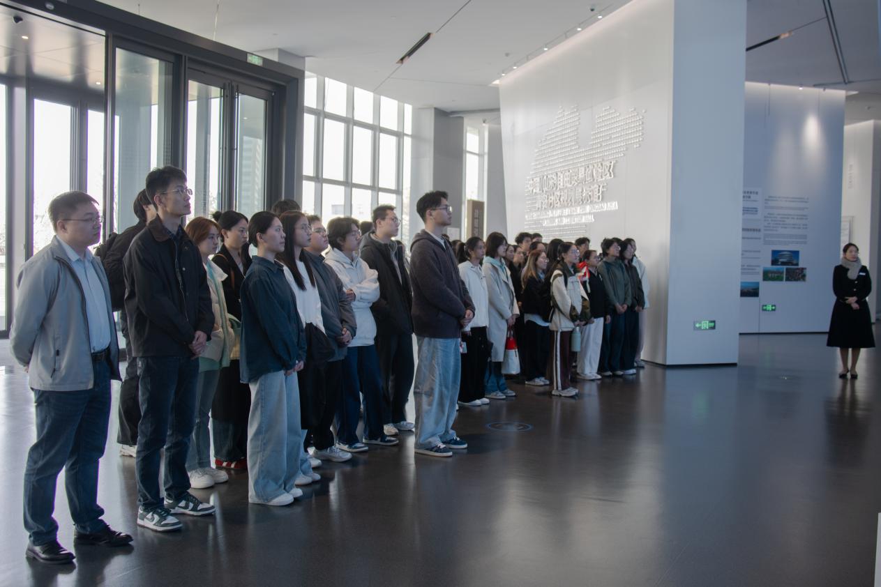 师生一行首先来到中国(山东)自由贸易试验区青岛片区规划展示馆。在讲解员的引导下,大家通过一段全景式介绍短片,初步了解了青岛自贸片区的战略定位、发展历程及近年来取得的突出成就。随后,师生步入展馆核心区域,细致观摩了片区在高端制造、国际贸易、金融服务与实体经济耦合发展等方面的创新实践与建设成果。展示馆内丰富的图文资料、数字沙盘和互动演示,生动呈现了青岛自贸片区作为对外开放新高地的蓬勃活力。